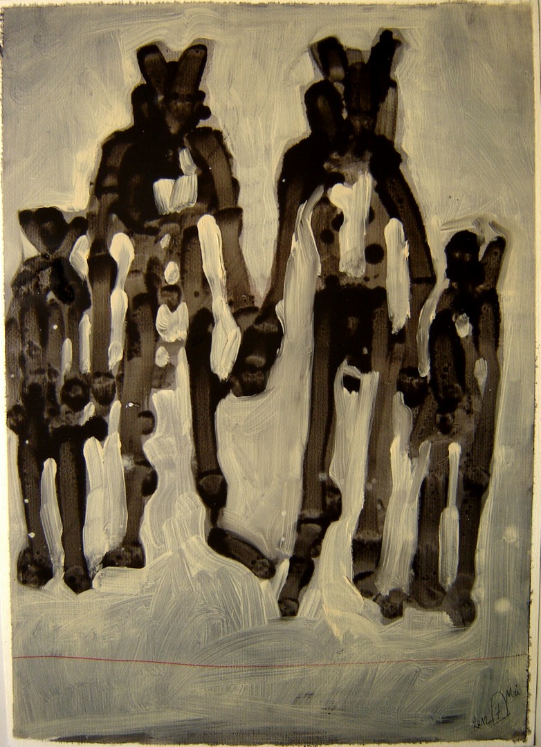 Des hommes marchent. Des hommes sont en marche. Ils marchent. Vers où ? Nul ne sait, vers quoi ? Nul ne sait encore. Quelque chose n'est pas dit. Quelque chose est tû. Le chemin n'apparaît pas, l'horizon reste flou. Le paysage qui entoure ce cortège d'hommes en marche peut-être la très haute montagne, à l'aube, ou de nuit. Ce paysage peut être encore tout autre chose, une plaine, basse, qui s'accroche aux nuages improbables et opaques. Les pas sont à peu près sûrs, le silence pesant semble luire comme un reflet de glace. La banquise, en surface gelée, vient s'éterniser sous des pas insolubles. Rien n'est dit, la cordée est étrange, elle relie comme une ligne, des hommes chancelants. Itinéraires retardés, chemins perdus.